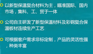 公司是一家瞄準(zhǔn)國際、國內(nèi)市場,集科、工、貿(mào)于一體的綜合性公司,擁有各類先進的設(shè)備100余臺(套),公司自主研發(fā)了新型保溫材料及彩鋼復(fù)合保溫板材連續(xù)生產(chǎn)工藝,建成了機上一次成型彩鋼復(fù)合保溫板材的生產(chǎn)線...
